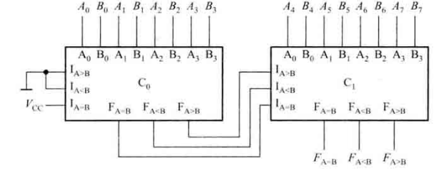 (1)串联:低4位的比较结果应作为高4位的条件,即低4位比较器的输出端应分别与高4位比较器的IA>B、IA<B、IA=B端连接。