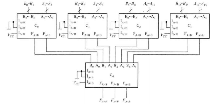 (2)并联:采用两级比较方法,将16位按高低位次序分成4组,每组4位,各组的比较是并行进行的。将每组的比较结果再经4位比较器进行比较后得出结果。