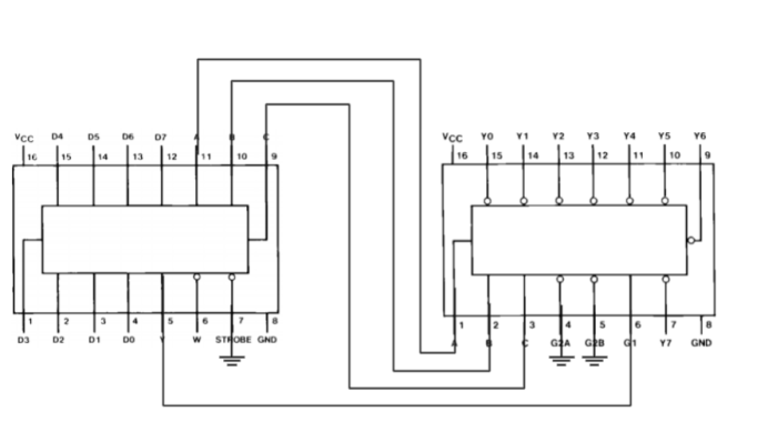 答:如图所示,两片芯片的A、B、C连在一起,再把74LS151的输出端Y连在74LS138的使能控制端G1上面。利用74LS151来控制74LS138。