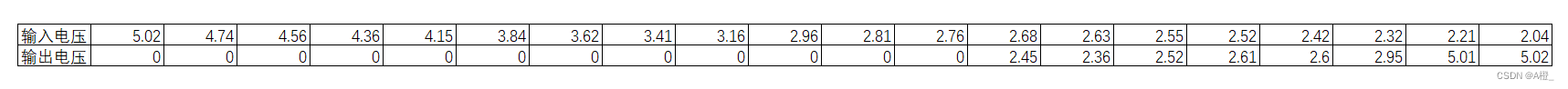 由于是接入双输入与非门测量输出电压,一开始的高电平输出结果是0,可以观察到在2.76v到2.68v之间,高电平变为低电平,即高电平需要的输入电压大概在这个范围内。