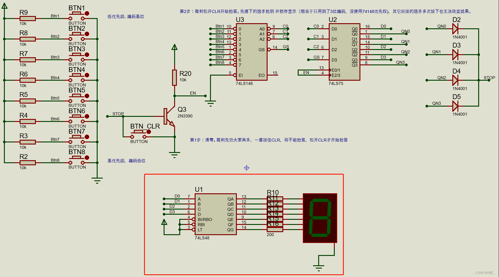 1.了解了八人抢答器的电路原理,共阴极数码管的原理