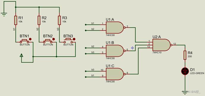 三人表决器共有三个输入信号,当有大于等于两个信号输入为高电平时,电路输出高电平,LED灯亮。电路由三个双输入与非门,一个三输入与非门构成。