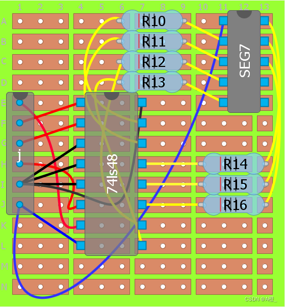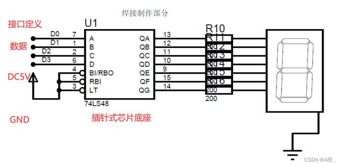 共阴极数码管的连接:四个输入分别为1,2,4,8,配合显示各个数字