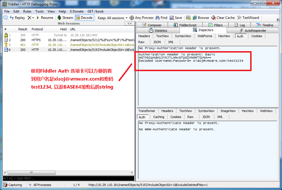 使用Fiddler Inspectors 下的Auth 选项卡,可以很方便的看到用户名和密码: