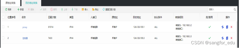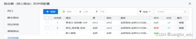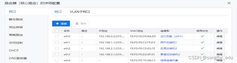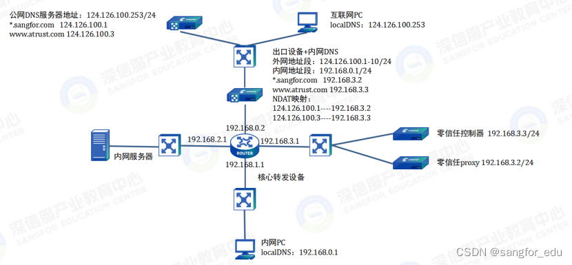 出口设备+DNS:配置路由、映射以及内网DNS的解析记录*.sangfor.com 和www.atrust.com的A记录解析,该部分用于实现内网的DNS解析功能,以实现内网的业务引流。