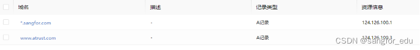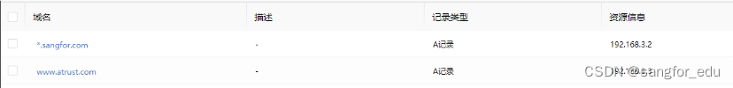 互联网DNS:*.sangfor.com 泛域名解析,www.atrust.com的A记录解析,泛域名记录,用于引流使用,用户在互联网访问相关域名时候,可以将流量引流到零信任设备。