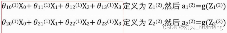 如上图所示,就是神经网络的输入层和第一个隐藏层之间的计算,我们可以发现上面的红框其实就是矩阵运算Θ(1)X,所以我们可以将上面的计算向量化。