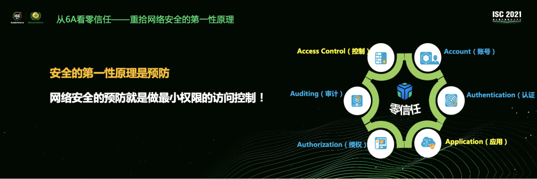 本论坛的主题是6A,当然也要讲讲我的理解,这里的心法就是看变化,以前咱们都提4A嘛,新出来哪两个A呢,一个是控制,一个是应用,我想这是让我们重拾网络安全的第一性原理,我认为是预防,而网络安全的预防就是最小权限的访问控制,不只控制客户端访问服务端,还要控制服务端内部应用跟应用之间的互访,做到6A,你也就做到了零信任。