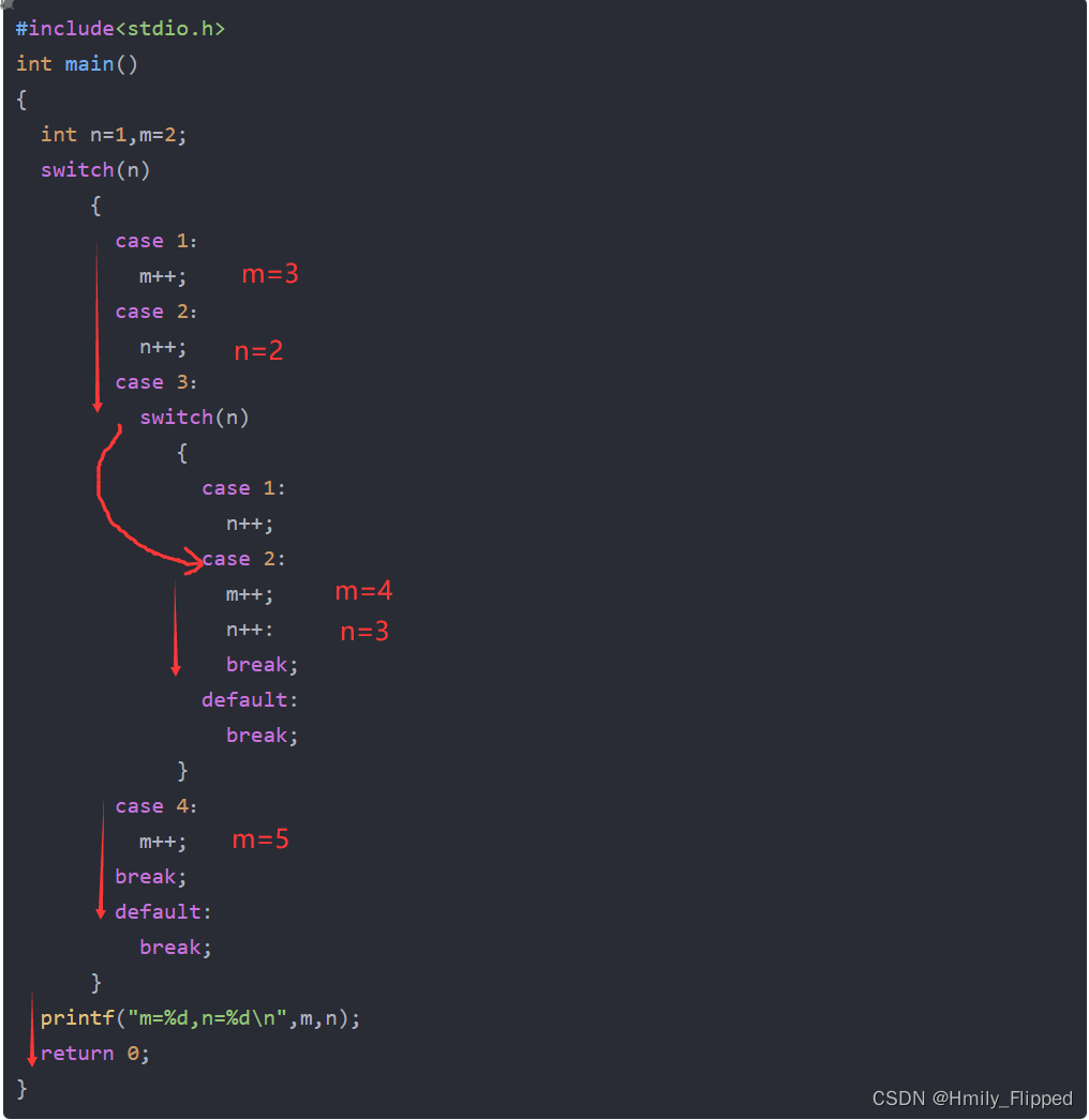 该程序输出结果为:m=5,n=3。其原因就是break第一次退出只是退出嵌套进去的那一个switch,然后继续往下面进行。