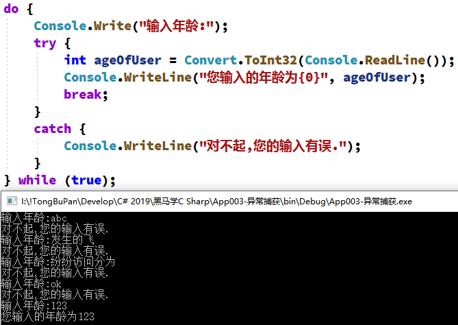 如上,当用户输入的数据符合我们的预期(用户正常输入数字),程序正常执行;而当用户执着的输入非数字型数据时,程序的异常处理代码进行相应处理.这样我们的代码更加健壮而不会随时出现异常而意外终止.