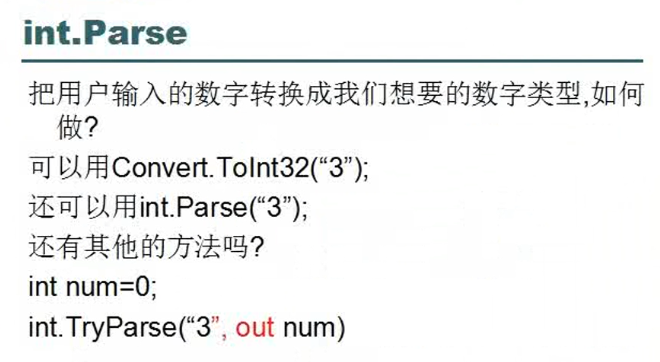 int.Parse方法:将字符串转换为数值,失败则抛出异常.