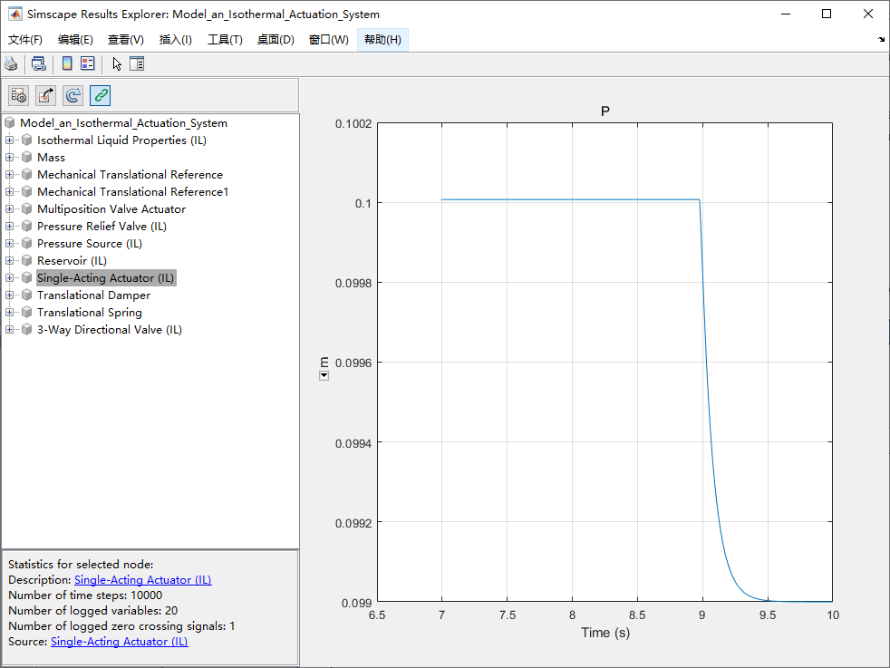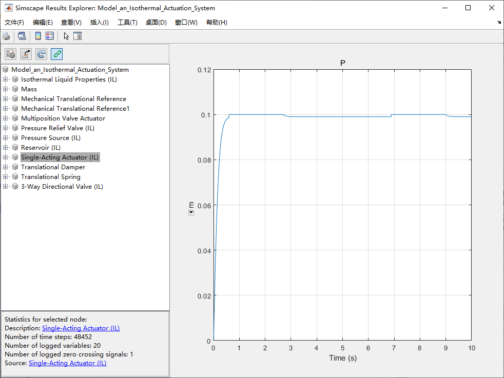 当使用Matlab/Simscape进行仿真的时候,通过单击任何块(例如多位置阀执行器块),然后在Simscape块选项卡中选择Results Explorer,用Results Explorer检查结果。结果资源管理器将显示模型中的每个变量,包括内部变量,这些作用域不能由Scope块报告。 单击左侧窗格中的单作用执行器(IL)选项。 这显示了端口P处的物理信号或执行器轴位置的曲线图。 单击选项旁边的加号以查看为单作用执行器(IL)块记录的变量。