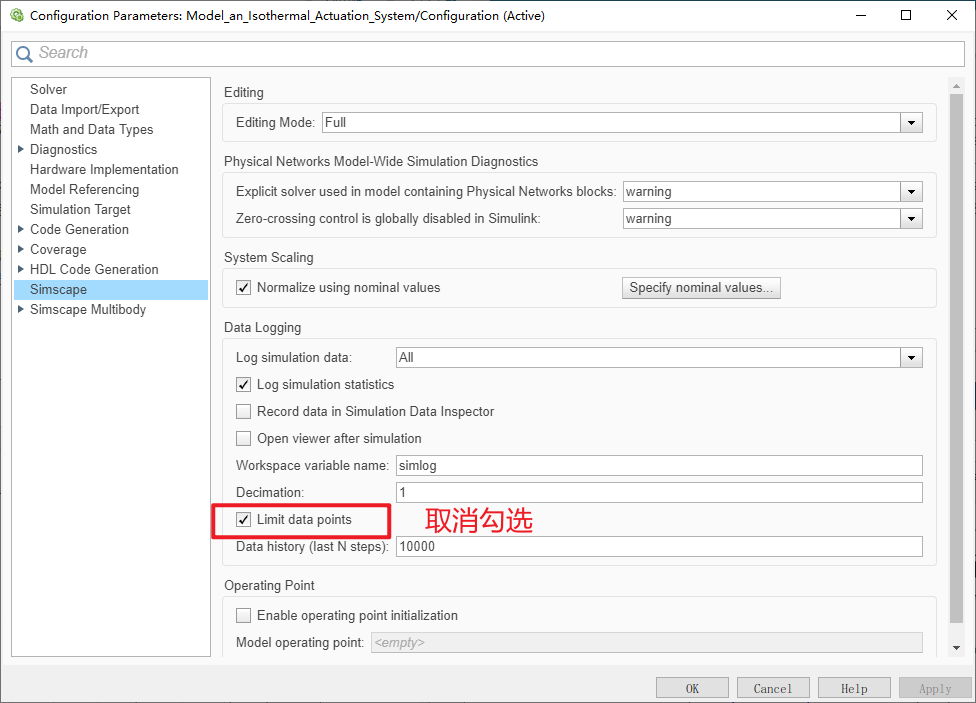 - 打开配置参数对话框。 在Simulink工具栏中的“建模”选项卡上,选择“模型设置”,然后在左侧窗格中单击“ Simscape”。