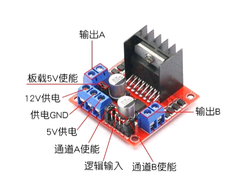 2、板载5v使能的跳线帽要接上,一般在商家买回来的l298n模块都是接上了的