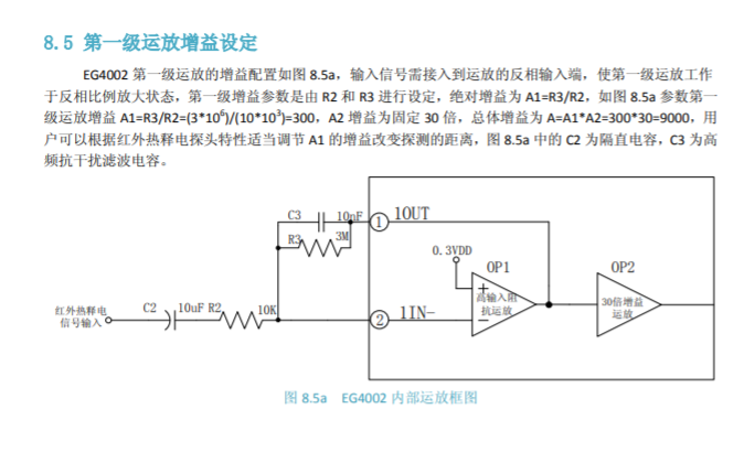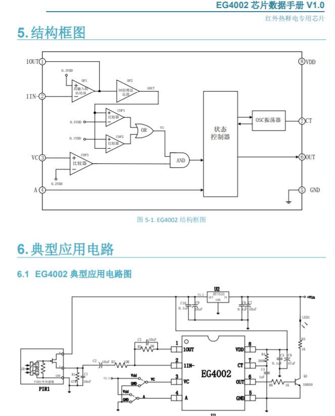芯片数据手册 V1.0 1.特点 8 引脚数红外热释电专用芯片,外围电路简单,成本低 静态功耗小,3V 工作电源时功耗小于 45uA, 5V 工作电源时功耗小于 75uA,非常适合电池供电系统应用 高输入阻抗运算放大器,可与多种传感器匹配,进行信号与处理 双向鉴幅器,可有效抑制干扰 内置参考电压,供内部比较器和运放的参考电压 内设延时时间定时器和封锁时间定时器,改变振荡器频率即可设定定时延时时间 外围元器件少,只需配置第一级运放的增益和振荡器的 RC 器件即能可靠工
