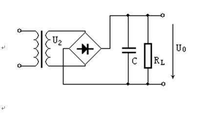 交流电经过全桥整流电路之后将变为馒头波,再经过电容C滤波后将变为带有纹波的直流电。