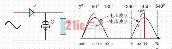 1.电容C在T0-T1的时间段充电,二极管正向导通,当交流输入达到峰值时,电容电压也随之达到峰值。