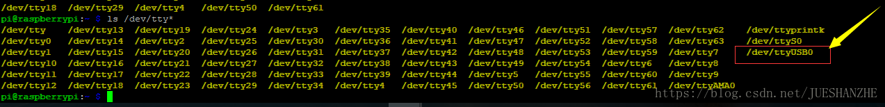 查看串口信息(一般都为ttyUSB0或者ttyUSB1等,如果直接把Arduino插到树莓派,串口信息为(ttyACM0))