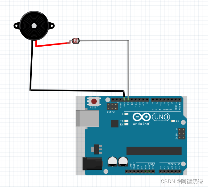 按照Arduino教程将控制板连接好,下载线接好。光敏电阻的一端接在数字13口,另一端与蜂鸣器正极相连,蜂鸣器的负极和GND相连。