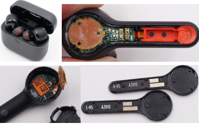 盖板内侧有L/R左右标识,型号A3910,蓝牙天线。耳机内部结构,中间有两个蓝牙天线触点。