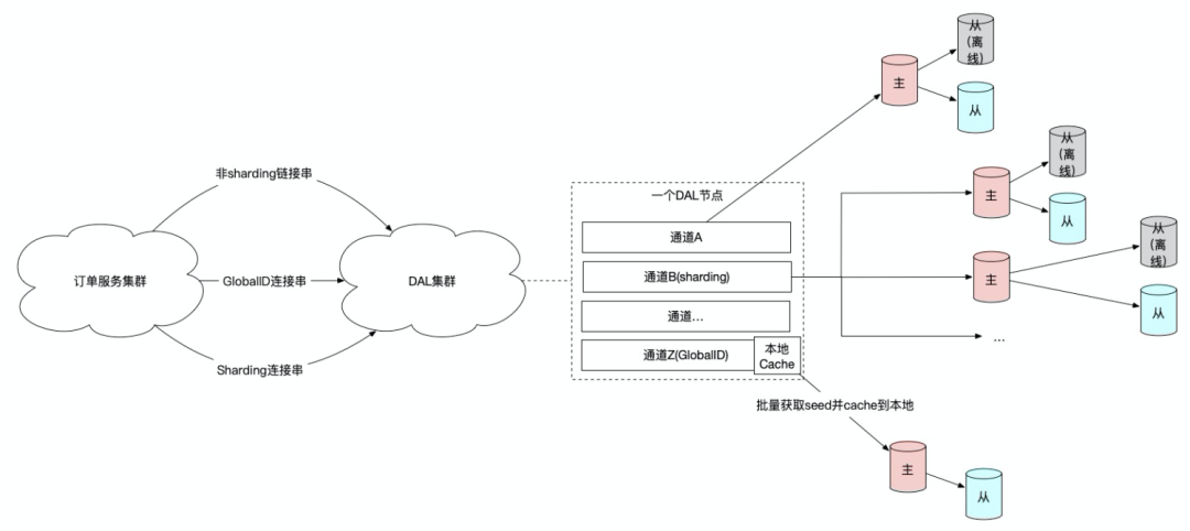 我们其实是做了两维 Sharding ,两个维度都是 120 个分片,但是可以通过三种方式路由(用户 ID、商户ID、订单ID),写入优先保证用户维度成功。由于资源的原因,用户和商户分片是交错混合部署的。