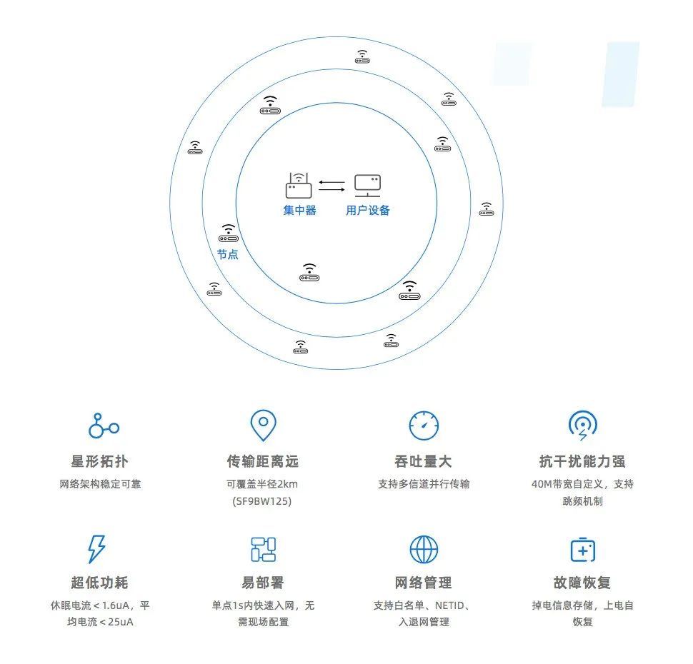 整套网络采用星型拓扑,单集中器下支持2000个节点接入,单级通信距离2km,工作在470-510MHz非授权频段。节点入网成功后与集中器建立双向通讯连接,用户无需关注网络层协议情况,直接通过串口交互完成数据传输、网络管理等功能。