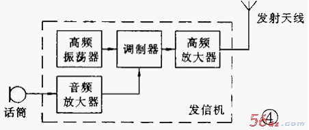 4 .高频放大器将调制后的信号放大,增加能量,并通过天线把已调信号以电磁波的形式辐射到空间去,传播到远方。以上四个部分的电路组合称发信机。图 4 为发信机的简单框图。