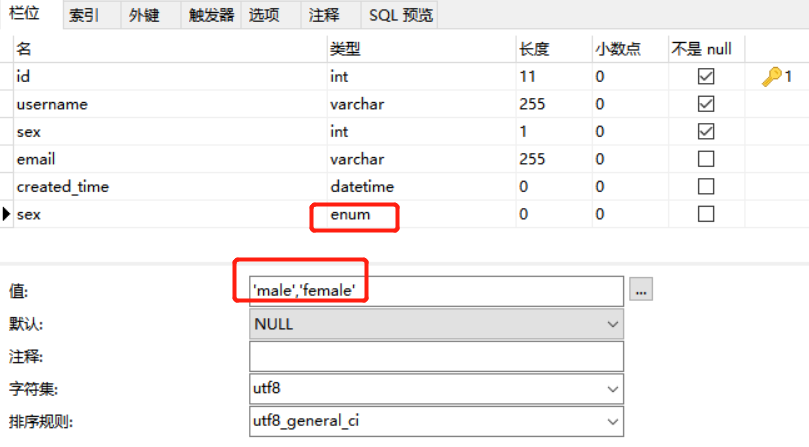 - 有限而且固定值列:如 enum('男','女') not null , status enum('开启','关闭') not null