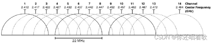 每个信道的有效带宽为20MHZ,一共有14个信道,我国有13个信道(1-13),2.4GHz频道下互不干扰的信道有1、6、11/2、7、12。