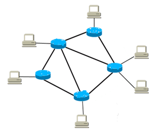如图所示,网状结构的特点是网络中任何两个结点之间均有链路连接,任何两结点间均可直接通信。这种网络的可靠性高,因为每一结点和其他结点都有通信链路相连,如果某条链路发生故障,不能通信,那么可通过其他结点进行转发来达到通信的目的。由于任何两结点之间均有专用的通信链路,即不是多个结点共享一段通信链路,因此不存在因等待链路而造成的通信延时。但是这种结构的缺点是网络连接的布线(电缆或光纤)的数量大大增加,如网络中有n个结点,则共需连接的链路数目为:n(n-1)/2。如果这些结点分布的地理空间达到几千公里,那么通信链路所需的代价很大,而且实际安装也是很困难的。这种网络结构只用在要求高度可靠,且对链路带宽要求高的场合。在一些由多个网络组成的互联网中,它的骨干网( backbone)通常采用网状结构。