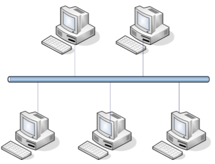 如图所示,图中的传输线是同轴电缆,计算机与同轴电缆间的连线也是一段同轴电缆它们之间用分接头连接(图中未画出),任何两台计算机之间的通信都通过这根称为总线(bus)的同轴电缆进行传输,显然,这是最节省传输线的方法,可是电缆的故障会使整个网络不工作。早期的以太网( Ethernet)就采用这种结构。