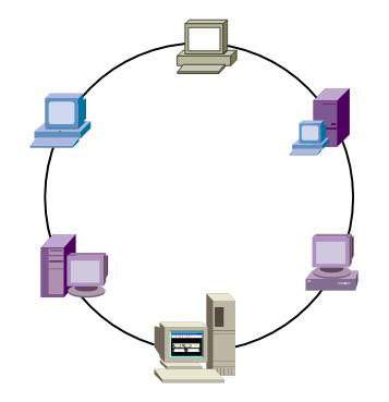 如图所示,每台计算机用连线与接口相连,计算机的数据发送和接收都通它的接口进行,发送时把数据送到环上,接收时从环上接收其他计算机发来的数据。数据在环上沿一个方向通过各个接口传输,到达目的地就停止传输。例如当H向E发送数据时,如果信号在环上沿着顺时针的方向传输,则H将要发送的数据通过它的接口送到环上,经过A、B、C和D的接口的转发,最后到达E的接口,传输到计算机E。这种网络在早期的局域网中应用,在目前的光纤网络中也有应用。