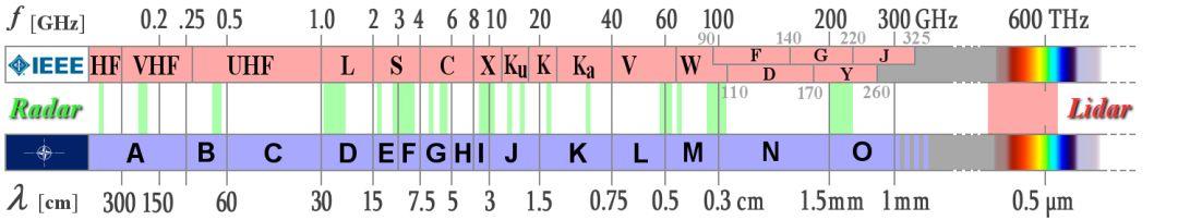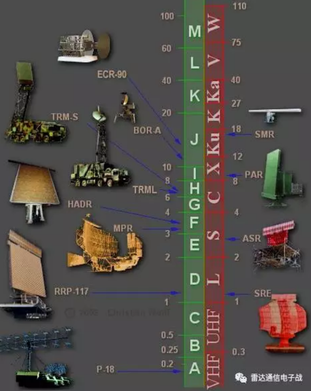 雷达波的频率属于涉密信息,为了保密,雷达波的频段用一些字母来代替,如下图所示。雷达的频段在第三篇再展开介绍。