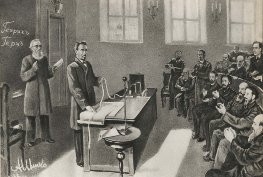 1896年3月24日,波波夫和助手雷布金在俄国物理化学协会的年会上,正式演示了用无线电传递莫尔斯电报码。