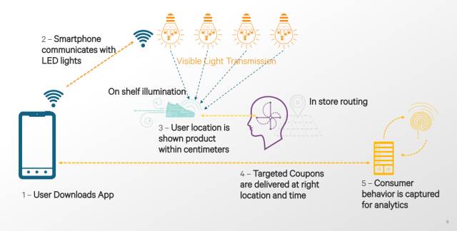 目前,可见光技术在北美有很多商场已经在部署。用户下载应用后,到达商场里的某一个货架,通过检测货架周围的灯光即可知晓具体位置,商家在通过这样的方法向消费者推动商品的折扣等信息。