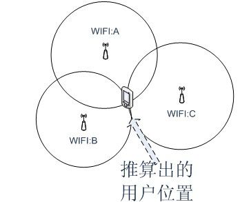 WiFi定位一般采用“近邻法”判断,即最靠近哪个热点或基站,即认为处在什么位置,如附近有多个信源,则可以通过交叉定位(三角定位),提高定位精度。