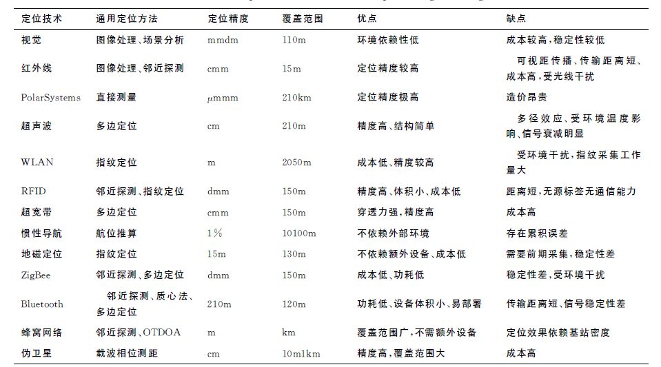 指纹定位法 | 在定位空间中建立指纹数据库,通过将实际信息与数据库中的参数进行对比来实现定位。 | 指纹定位的优势是几乎不需要参考测量点,定位精度相对较高;但缺点是前期离线建立指纹库的工作量巨大,同时很难自适应于环境变化较大的场景。 |