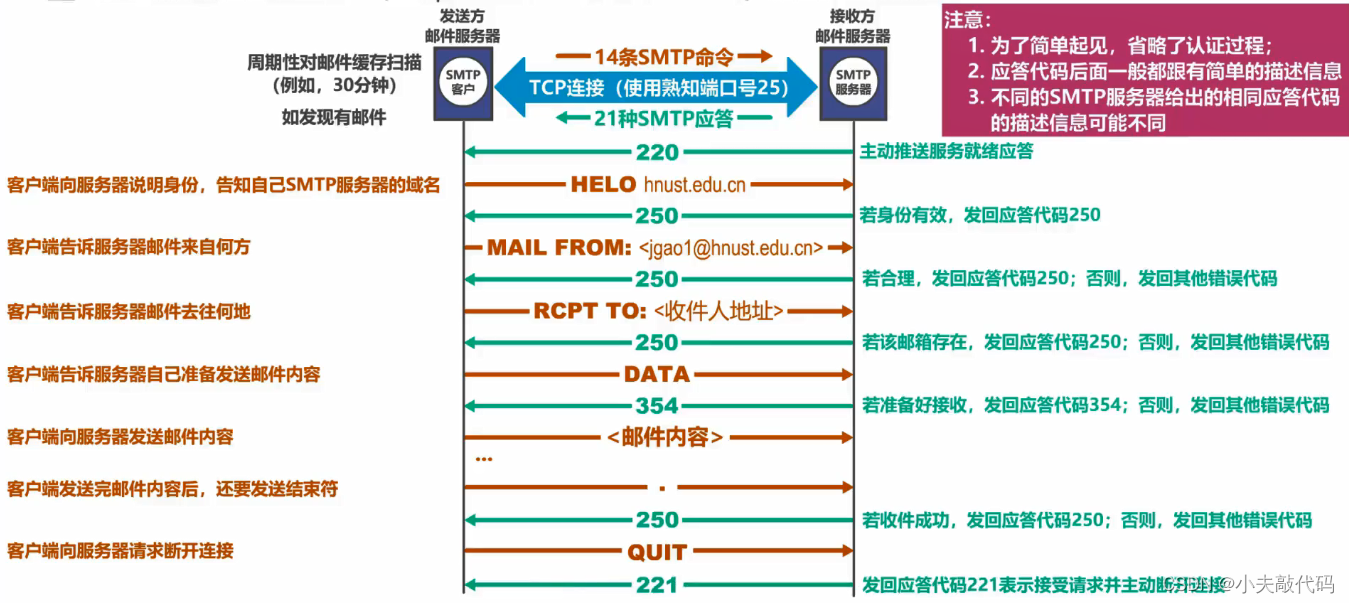 邮件发送协议:用于用户代理向邮件服务器发送邮件或在邮件服务器之间发送邮件。
