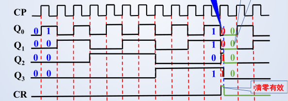 - C R = 1 CR=1 CR=1 时,异步清零,计数器输出数据 Q 3 Q 2 Q 1 Q 0 Q_3Q_2Q_1Q_0 Q3Q2Q1Q0 为 0000 0000 0000;