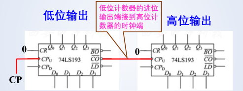 1111时,进位输出 C O ‾ overline {CO} CO 输出一个脉宽等于 C P U CP_{U} CPU 的低电平部分的低电平脉冲;当下一个 C P U CP_{U} CPU 上升沿到来时, C O ‾ overline {CO} CO 变为高电平,由此产生一个 C O ‾ overline {CO} CO 的上升沿;多个74LS193级联时,正好将低位的 C O ‾ overline {CO} CO 端与高位的 C P U CP_{U} CPU 端连接起来; -