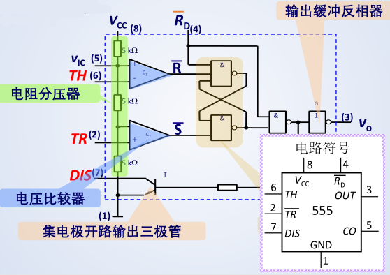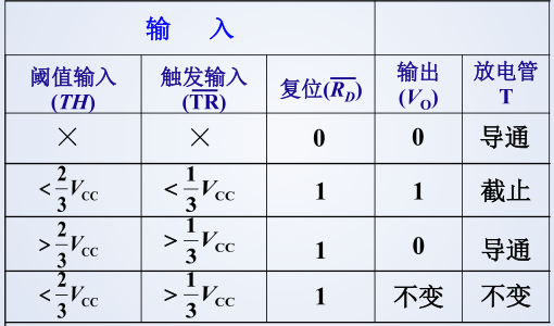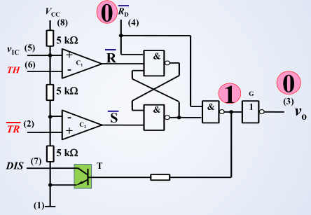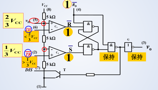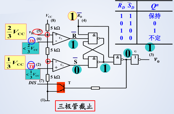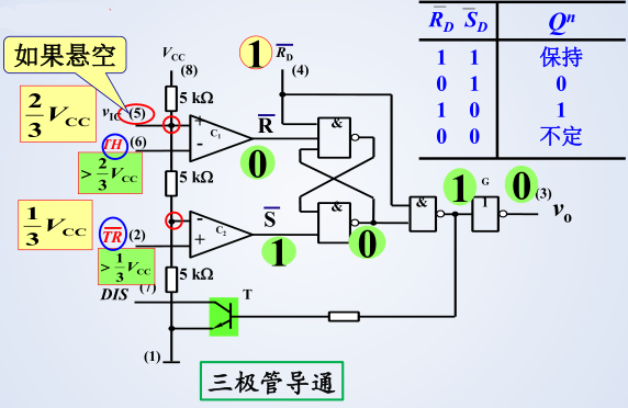 e. R D ‾ = 1 , T H > 2 3 V C C , T R ‾ < 1 3 V C C overline {R_D} = 1,TH > {2over 3} V_{CC},overline {TR} < {1over 3} V_{CC} RD=1,TH>32VCC,TR<31VCC时, R ‾ = 0 , S ‾ = 0 overline R = 0,overline S = 0 R=0,S=0,无意义。