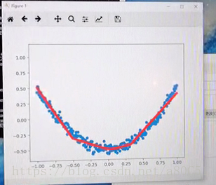 可以看到,Tensorflow的整个过程,是使红线的走向不断接近散点(蓝色)所展示出来的趋势。