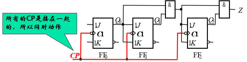 所有的存储元件都在时钟脉冲CP统一控制下,用触发器作为存储元件。只有一个“时钟信号”,所有的内部存储器,只会在时钟的边沿时候改变。