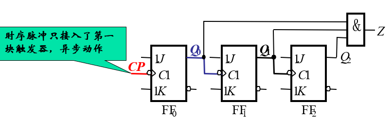 异步时序逻辑电路:没有统一的时钟脉冲信号,各触发器状态的变化不是同时发生,而是有先有后。