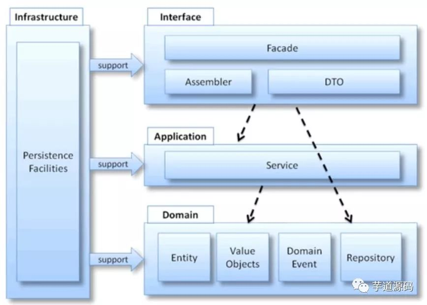 参考DDD的设计,DDD官方的架构草图,总体架构分为四层,Infrastructure(基础实施层),Domain(领域层),Application(应用层),Interfaces(表示层,也叫用户界面层或是接口层)