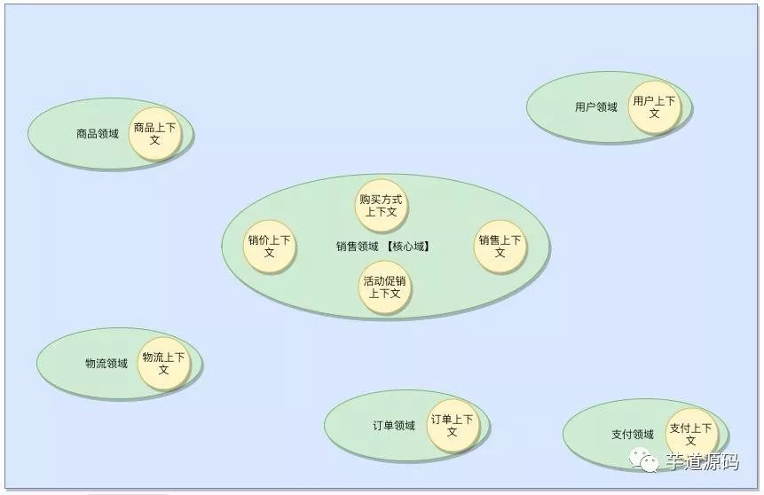 初步我们可以看出围绕销售核心域的包含的几大块内容,价格,销售方式,购买的方式,已经购买。然后我们对支撑着核心域的子域也做了划分,支撑着核心域的有商品域,用户域,通用域有订单域,物流域,支付域。