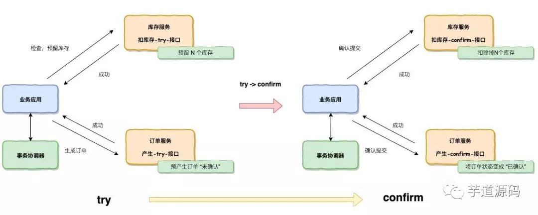 在try的时候,会让库存服务预留n个库存给这个订单使用,让订单服务产生一个“未确认”订单,同时产生这两个预留的资源, 在confirm的时候,会使用在try预留的资源,在TCC事务机制中认为,如果在try阶段能正常预留的资源,那么在confirm一定能完整的提交