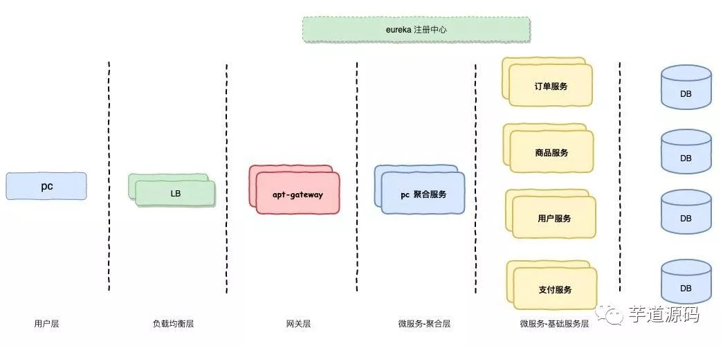 图中的 “pc聚合服务” 也是一个微服务,只不过它是属于聚合服务中间层,我们将为微服务进行逻辑划分,分为2个层: