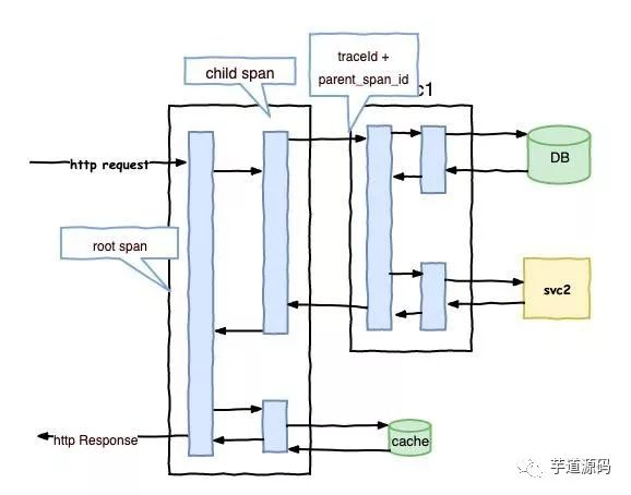 目前个大主流互联网公司中,ali有非常出现的鹰眼系统,点评也有一套很出名的调用链监控系统CAT。调用链监控其实最早是google提出来的,2010年google发表了一篇调用链的论文,论文以它内部的调用链系统dapper命名,这个论文中讲解调用链在google使用的经验和原理,大致的原理如下图: