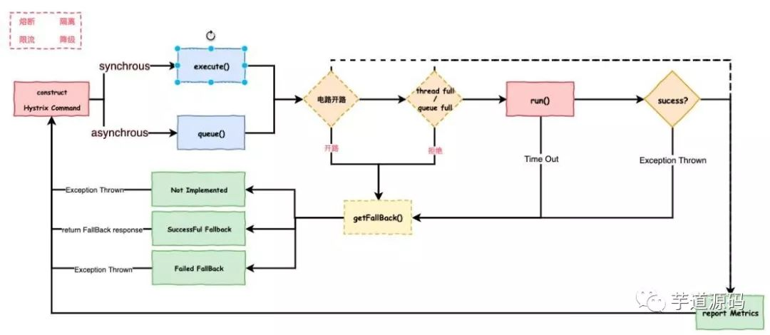 hystrix就把上面说的 熔断,隔离,限流,降级封装在这么一个组件里面 下图是hystrix内部设计和调用流程